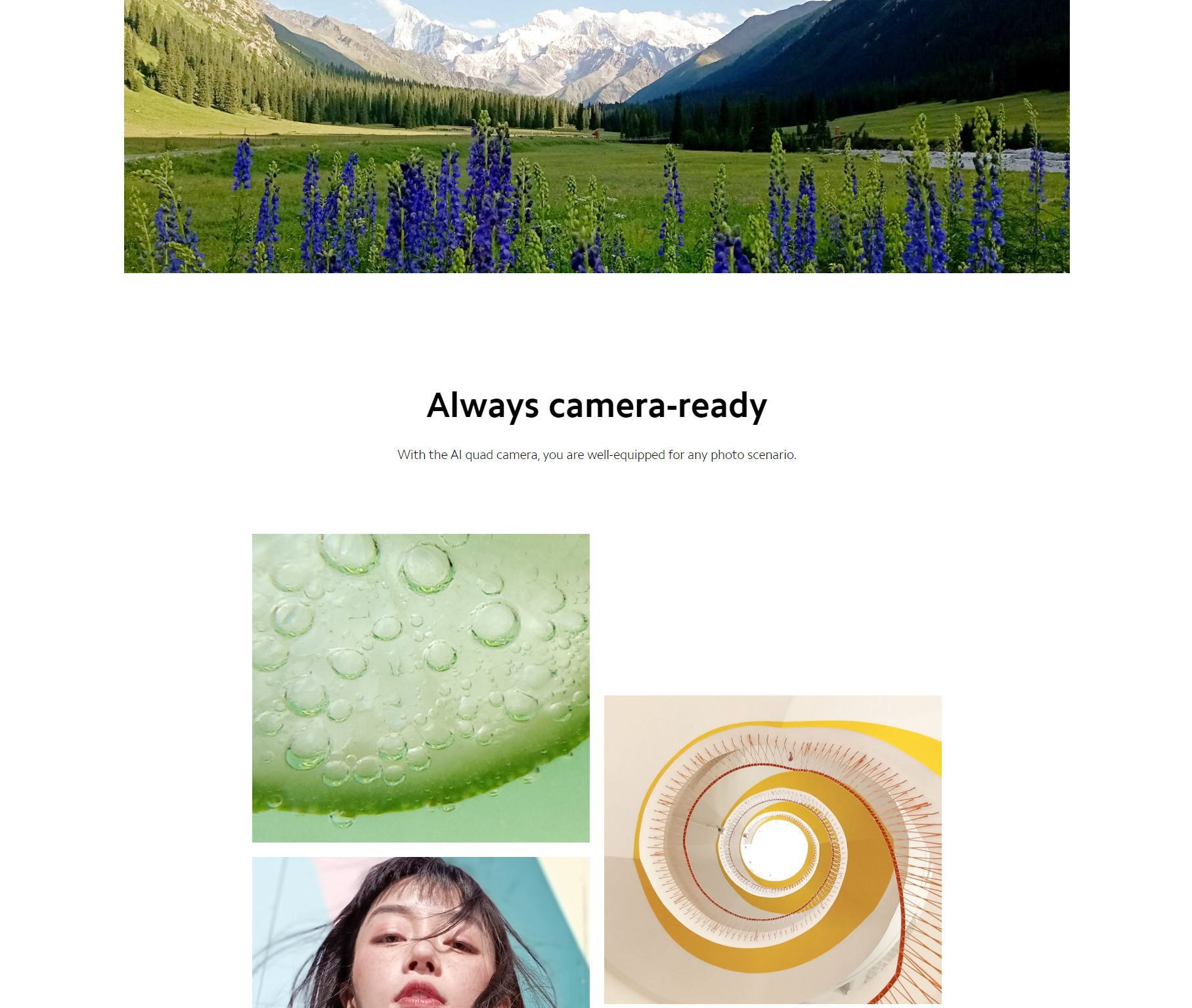 - 50MP AI quad rear camera · 50MP main camera f/1.8 · 8MP ultra-wide angle camera FOV 120° f/2.2 · 2MP macro camera f/2.4 · 2MP depth sensor f/2.4